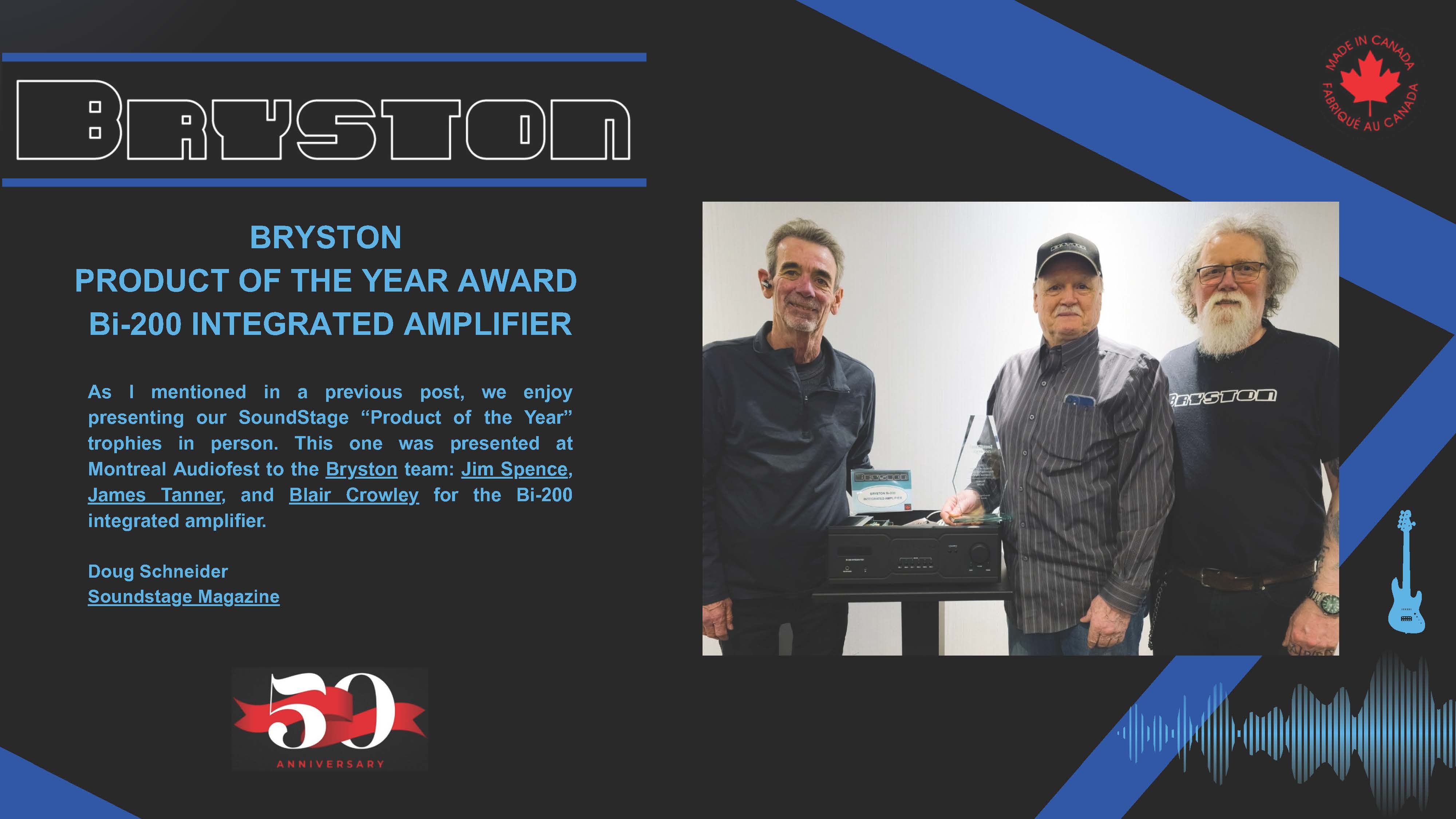 ''Product of the Year`` Bryston BI 200 in Soundstage Magazine 2026 March 27, 2026 Product of the Year Award Bryston BI200 Intergrated Amplifier